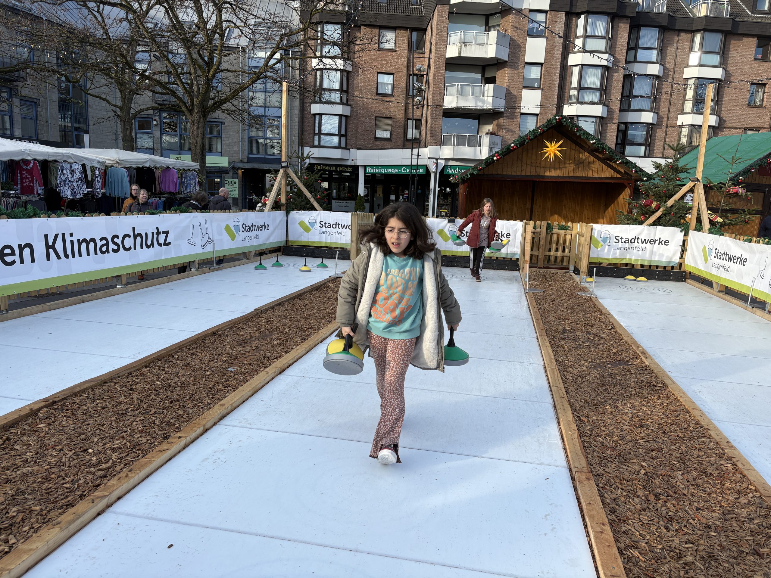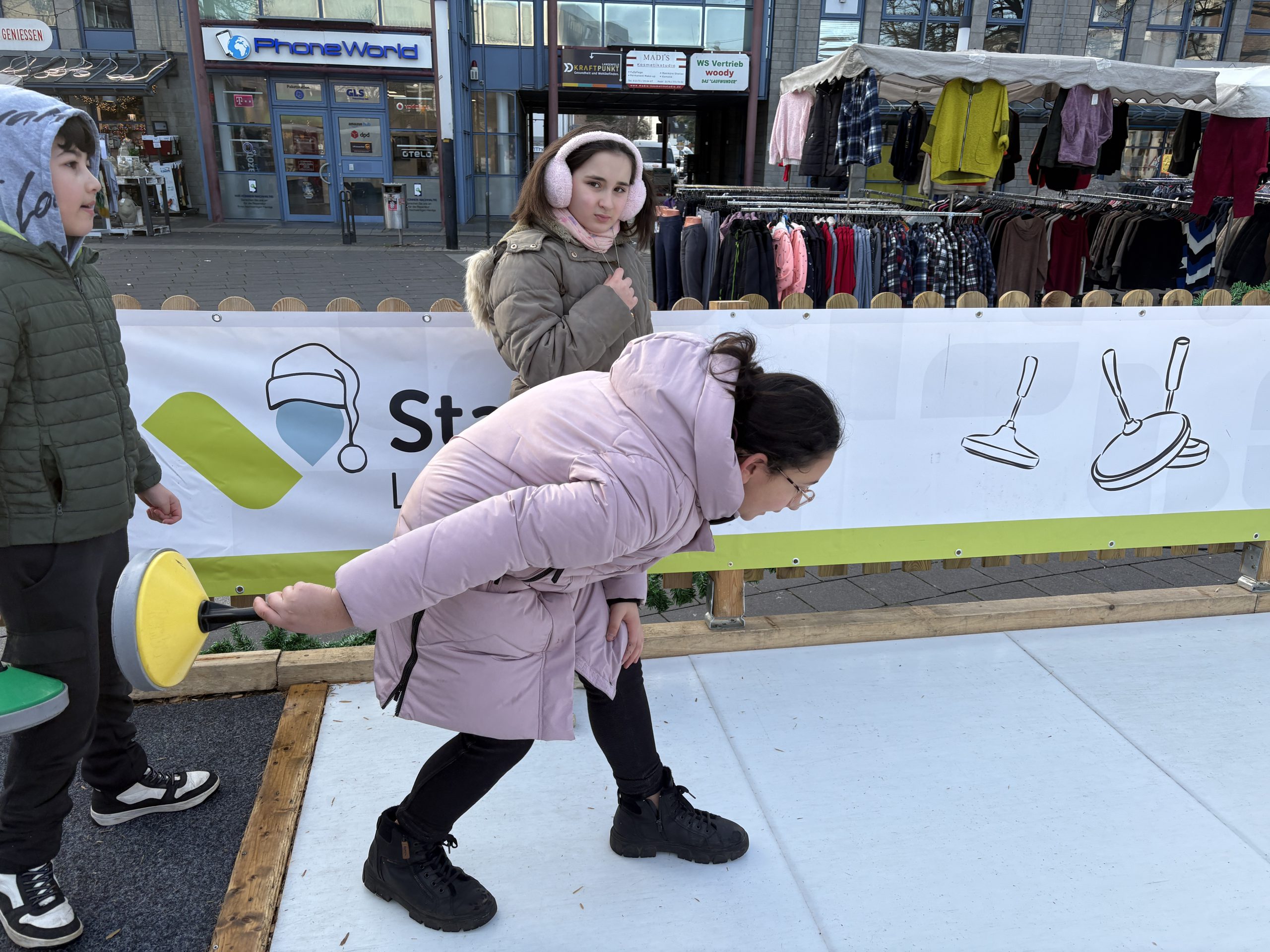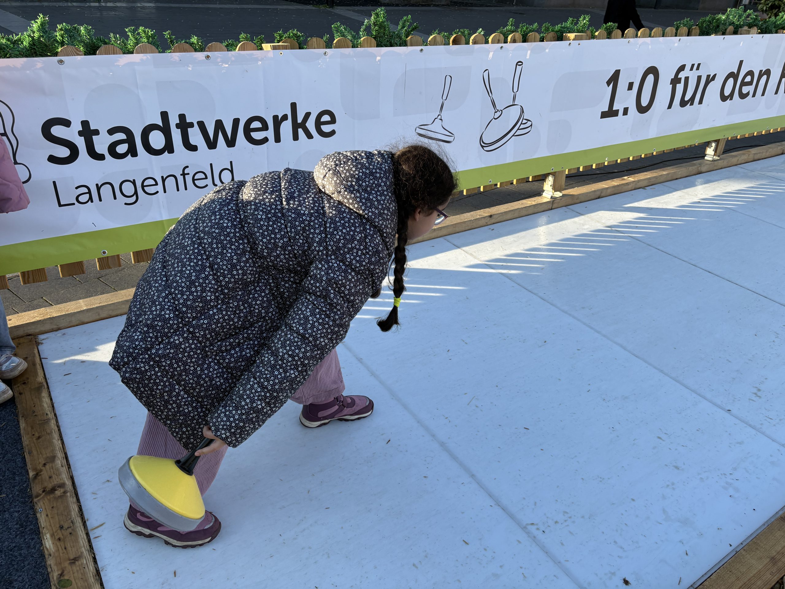 Jede Klasse war für eine ganze Stunde auf der nachhaltigen Eisstockanlage auf dem Marktplatz in Langenfeld und alle Kinder konnten ausprobieren, wie gut sie zielen und schieben können. Was sollen wir sagen: Es hat riesigen Spaß gemacht!